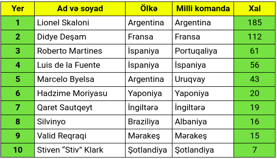 2023-cü ilin ən yaxşı milli yığma komanda məşqçisi təqdimatı üzrə yekun sıralama cədvəlini təqdim edirik:
